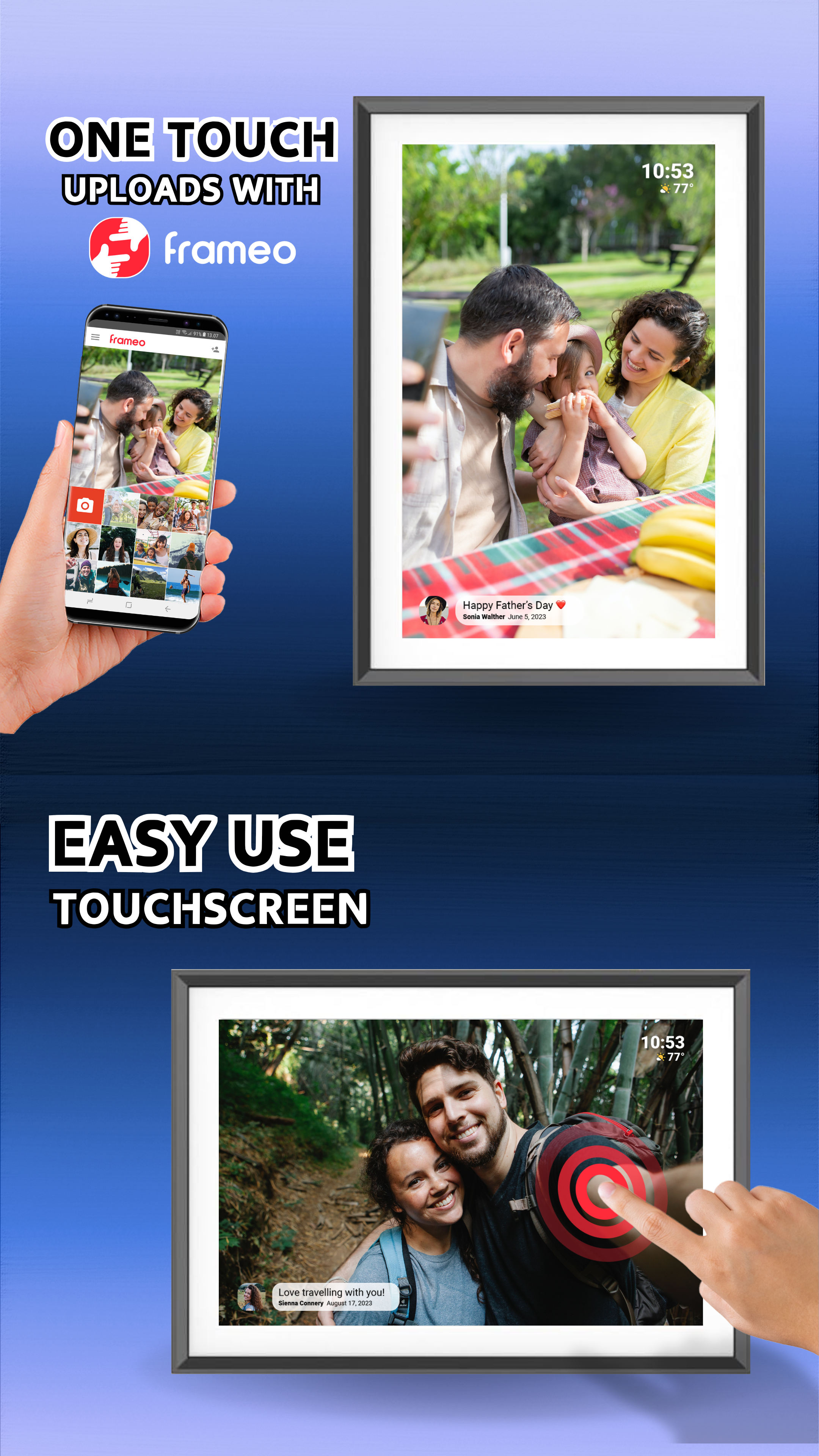 Setting up your Timebox™ frame is simple! Just plug it in, connect it to WiFi, and download the Frameo app on your phone or tablet. Once you’re logged into the app, you can start uploading photos and videos to your frame. The app is user-friendly, and setup should take just a few minutes.