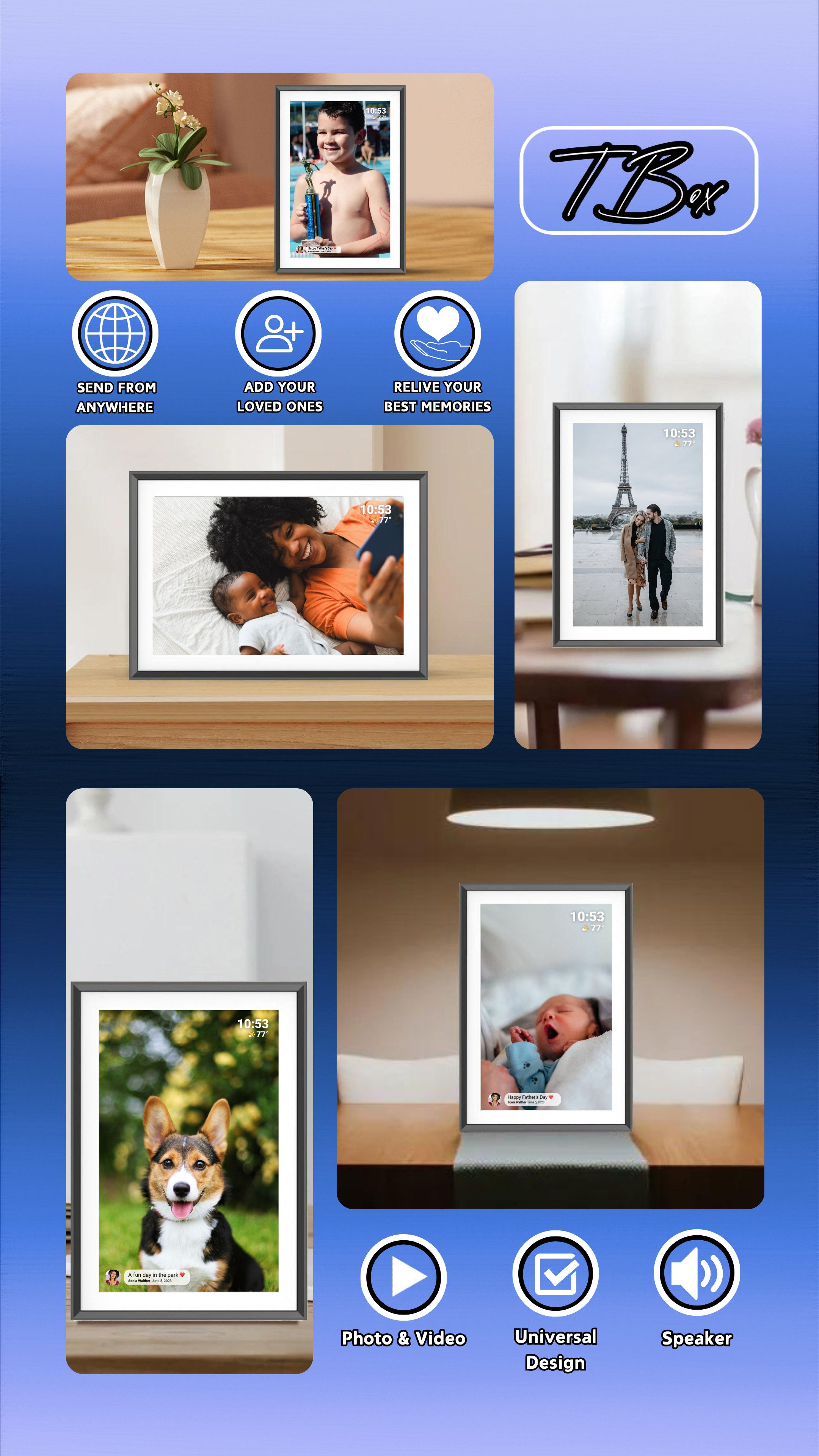You can upload both photos and videos to your Timebox™ frame. Whether it’s a beautiful family moment or a fun video from a vacation, the frame is designed to showcase your most cherished memories. Plus, with the built-in speakers, you can listen to any audio along with your content for an enhanced experience!