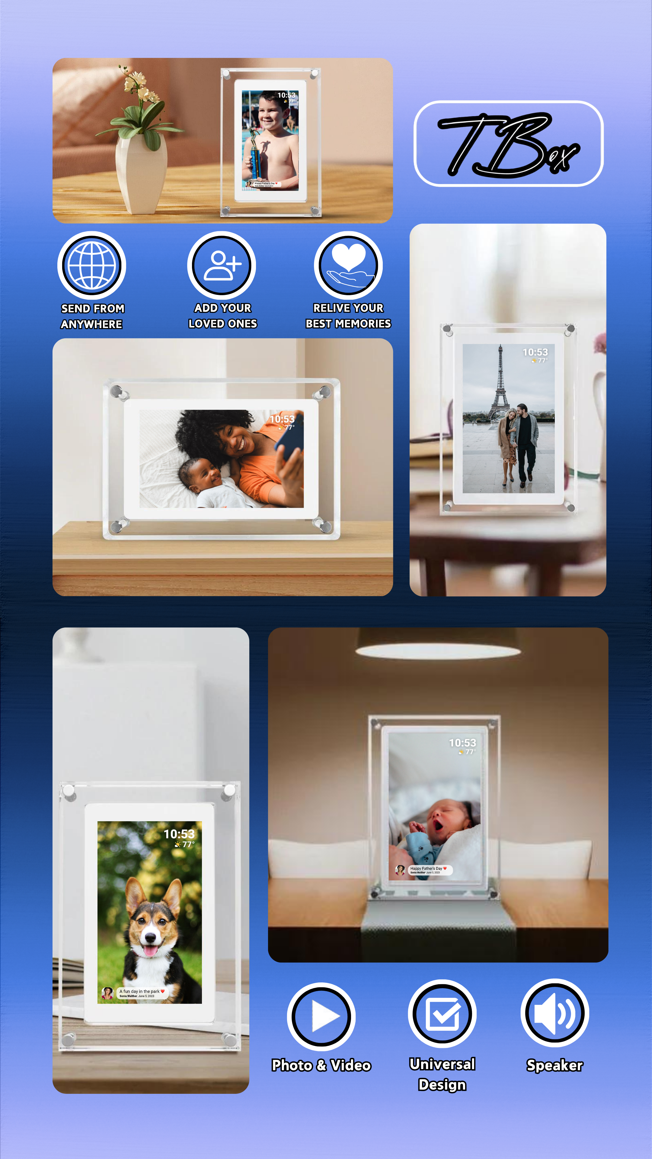 You can upload both photos and videos to your Timebox™ frame. Whether it’s a beautiful family moment or a fun video from a vacation, the frame is designed to showcase your most cherished memories. Plus, with the built-in speakers, you can listen to any audio along with your content for an enhanced experience!