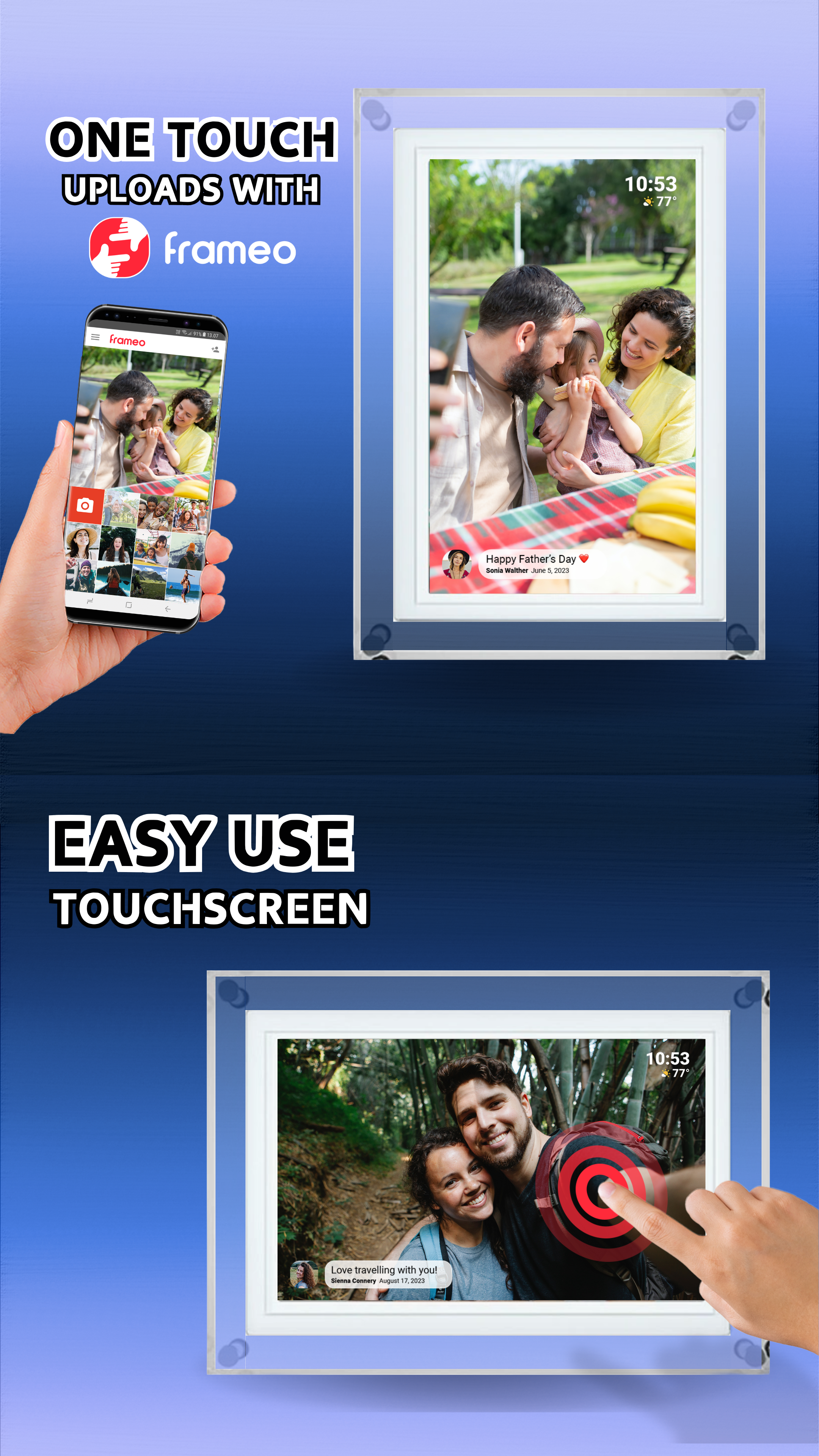 Setting up your Timebox™ frame is simple! Just plug it in, connect it to WiFi, and download the Frameo app on your phone or tablet. Once you’re logged into the app, you can start uploading photos and videos to your frame. The app is user-friendly, and setup should take just a few minutes.